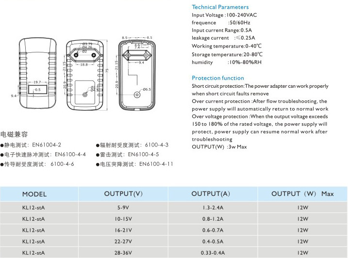 頻率:50/60Hz 輸入電流:0.5A 漏電電流:≤0.25A 工作溫度:0-40℃ 貯藏溫度:-20-80℃ 濕度:10%-80%RH 短路保護: 電源適配器在短路解除時能正常工作恢復 過流保護:過流故障排除后,電源將自動恢復正常工作 過壓保護:當輸出電壓超過額定電壓的150-180%時,電源將保護,故障排除后電源能恢復正常工作" />