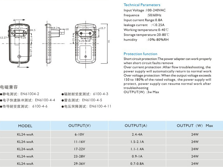 頻率:50/60Hz 輸入電流:0.8A 漏電電流:≤0.25A 工作溫度:0-40℃ 貯藏溫度:-20-80℃ 濕度:10%-80%RH 短路保護(hù): 電源適配器在短路解除時(shí)能正常工作恢復(fù) 過流保護(hù):過流故障排除后,電源將自動(dòng)恢復(fù)正常工作 過壓保護(hù):當(dāng)輸出電壓超過額定電壓的150-180%時(shí),電源將保護(hù),故障排除后電源能恢復(fù)正常工作" />