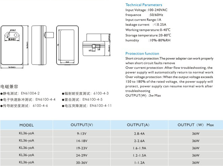 頻率:50/60Hz 輸入電流:1A 漏電電流:≤0.25A 工作溫度:0-40℃ 貯藏溫度:-20-80℃ 濕度:10%-80%RH 短路保護(hù): 電源適配器在短路解除時(shí)能正常工作恢復(fù) 過流保護(hù):過流故障排除后,電源將自動恢復(fù)正常工作 過壓保護(hù):當(dāng)輸出電壓超過額定電壓的150-180%時(shí),電源將保護(hù),故障排除后電源能恢復(fù)正常工作" />